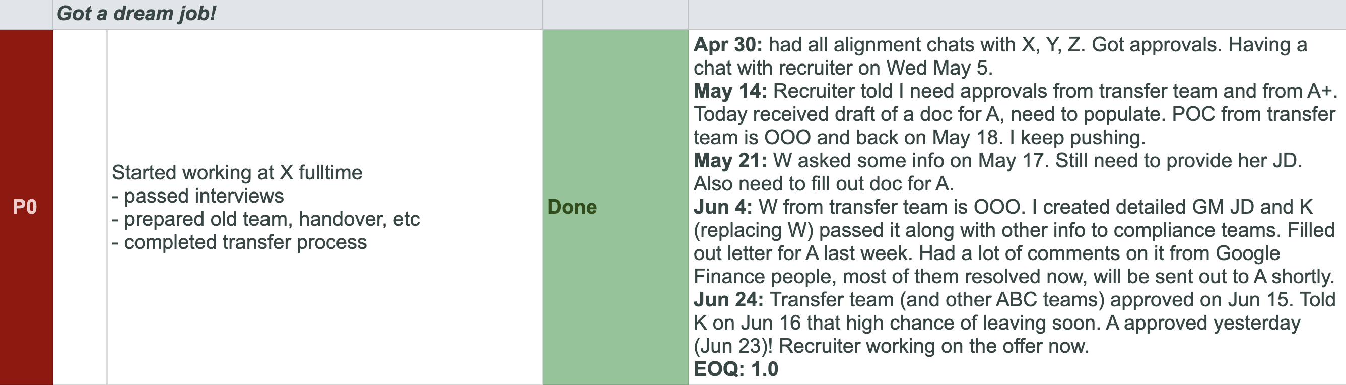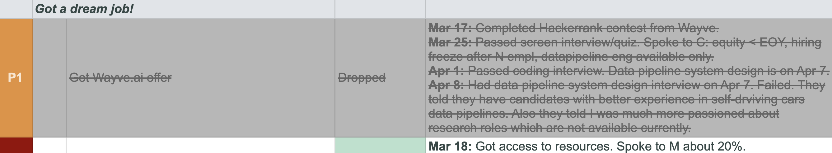 Sometimes you have to drop a key result. This is actually very satisfying as well, because you see you tried your best, and there's nothing else you can do here. So you drop the task and it no longer takes your mental space, which is great! Here's an example from Q2 2020 when I failed to get an offer: