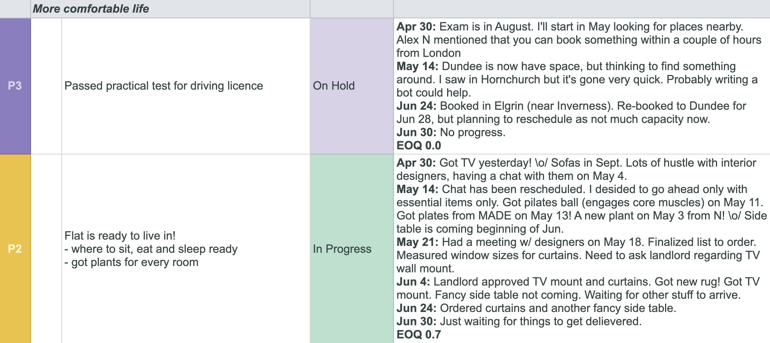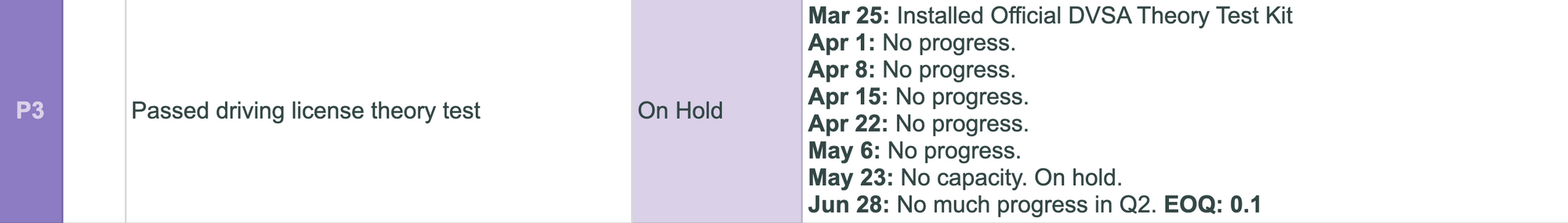 Failure is a part of learning. If you see you're constantly having "No progress" on some key results, you can easily spot this problem and think about why this is happening. If it's a P3 task, it's OK. If it's a P0 task, then you need to analyse. For example it could be some symptoms of burnout, maybe you need a vacation. Maybe next quarter you should aim for less tasks. All of this gives you an ability to understand yourself better. Example from Q2 2020: