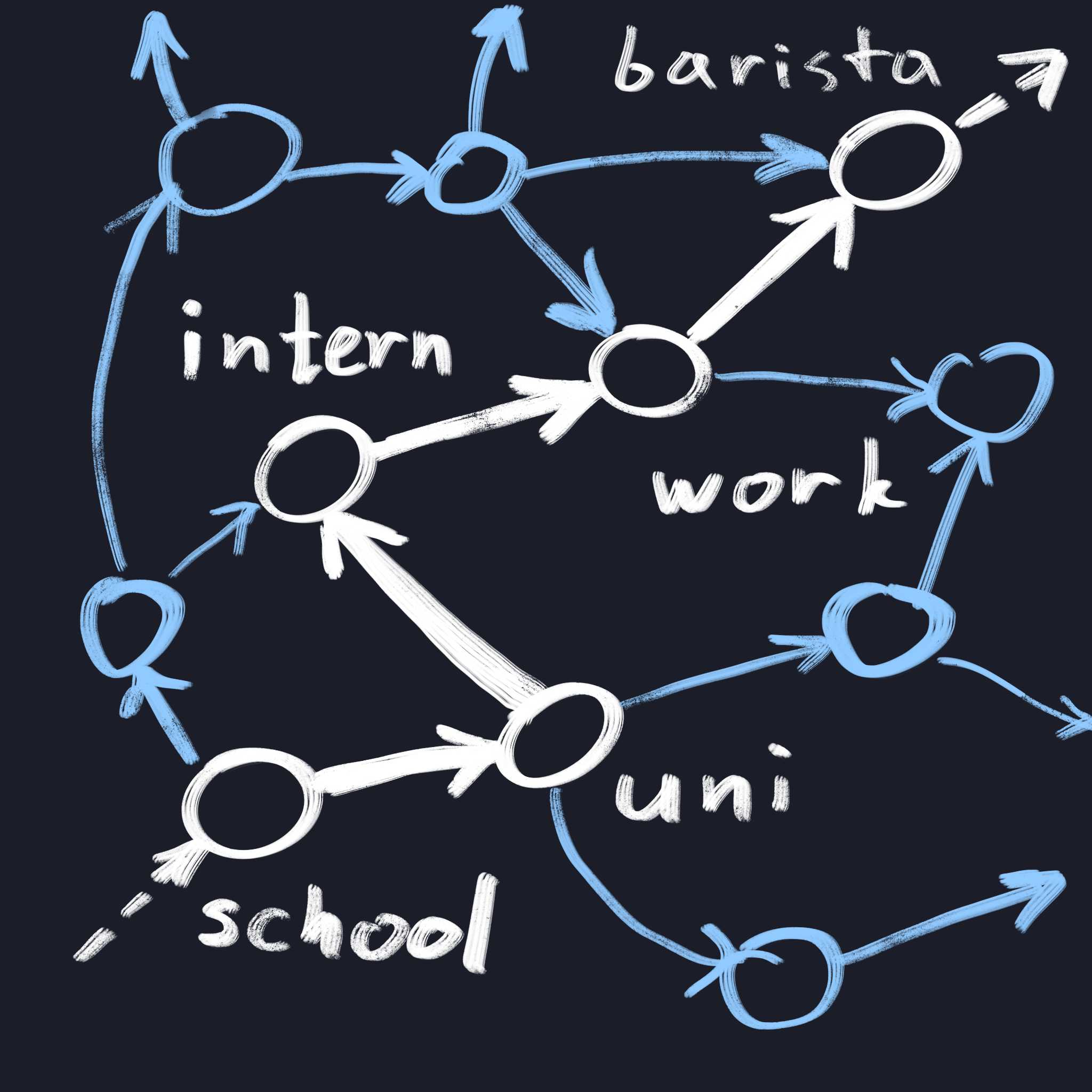 This way our journey in life is just following along the edges from one state to another. Sometimes we're trying to find a shortest path (famous graph theory problem) from one state to another (e.g. you're a Computer Science student and thinking what is the fastest/easiest way to become a Software Engineer at a Big Tech company, or how to become a venture capitalist, etc).