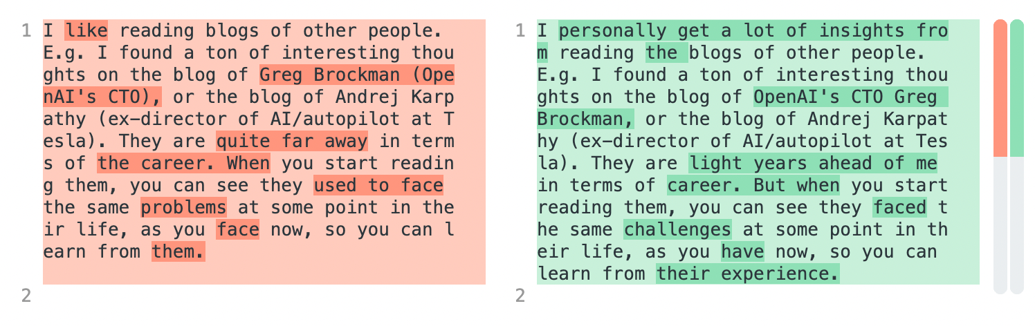 Another idea is to find a professional writer (or multiple), and pay them to rewrite your text in a nicer way. Then you can use diff-checker (the same way we’re doing code reviews), so you can see what changed.